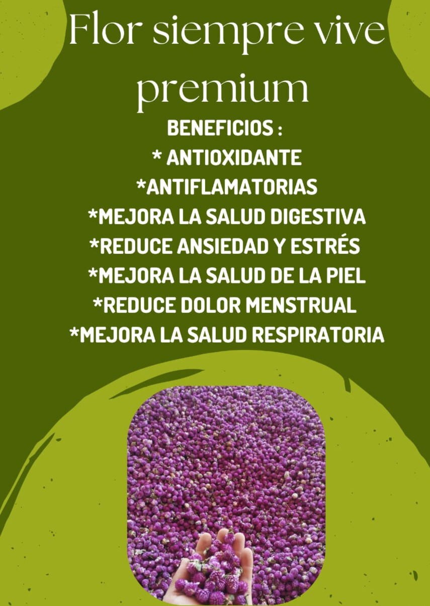 La flor siempre vive, también conocida como siempreviva, es una planta herbácea que tiene muchos beneficios - Tiene un efecto antiinflamatorio, diurético, desinfectante, astringente y cicatrizante, por lo que se puede usar para tratar heridas, quemaduras, picaduras, verrugas, acné, úlceras y otras afecciones de la piel. - Contiene aminoácidos esenciales, vitaminas, minerales, fitoestrógenos, antioxidantes y otros compuestos que ayudan a nutrir, hidratar, suavizar y reparar la piel. Se puede aplicar el jugo de la planta o preparar mascarillas y cremas caseras con ella. - Tiene un efecto antimicrobiano y antiinflamatorio, por lo que se puede usar para aliviar las infecciones del oído, como la otitis. Se puede aplicar unas gotas del jugo de la planta en el oído afectado. - Tiene un efecto refrescante, depurativo y digestivo, por lo que se puede consumir en infusiones, ensaladas o bebidas. Se dice que ayuda a eliminar toxinas, regular el azúcar en la sangre, prevenir el estreñimiento y mejorar el funcionamiento del hígado y los riñones. La flor siempre vive es una planta resistente y fácil de cultivar, que se adapta a diferentes condiciones climáticas y de suelo. Su nombre se debe a que sus flores se mantienen frescas y coloridas incluso después de cortadas o secas. Sus flores tienen forma de rosetas .